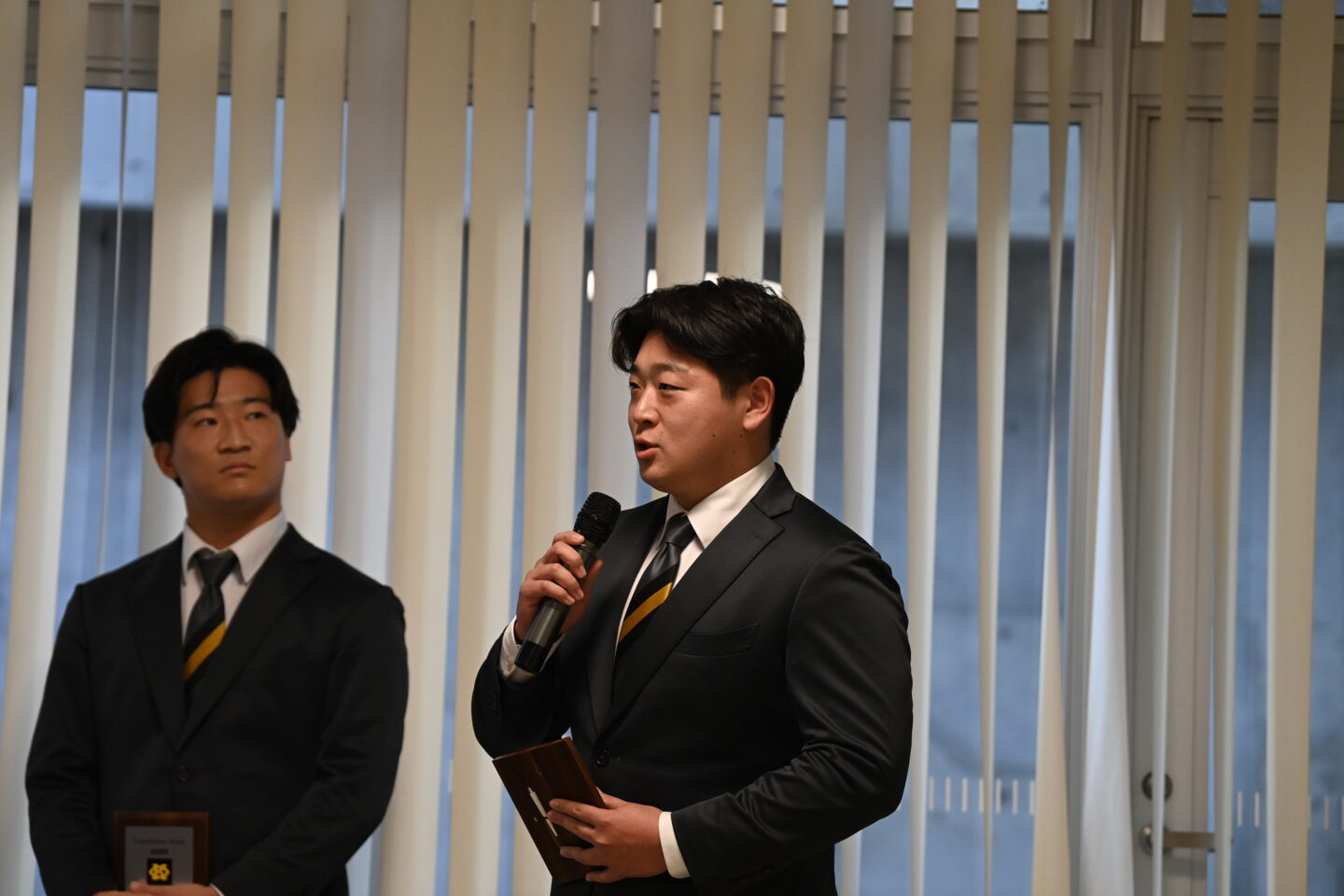 今野主将、山本副将より代表して日々サポートしてくださる方々への感謝、また共に過ごした同期や後輩への想いが語られ、最後に部歌斉唱をもって2025年度納会は閉会いたしました。