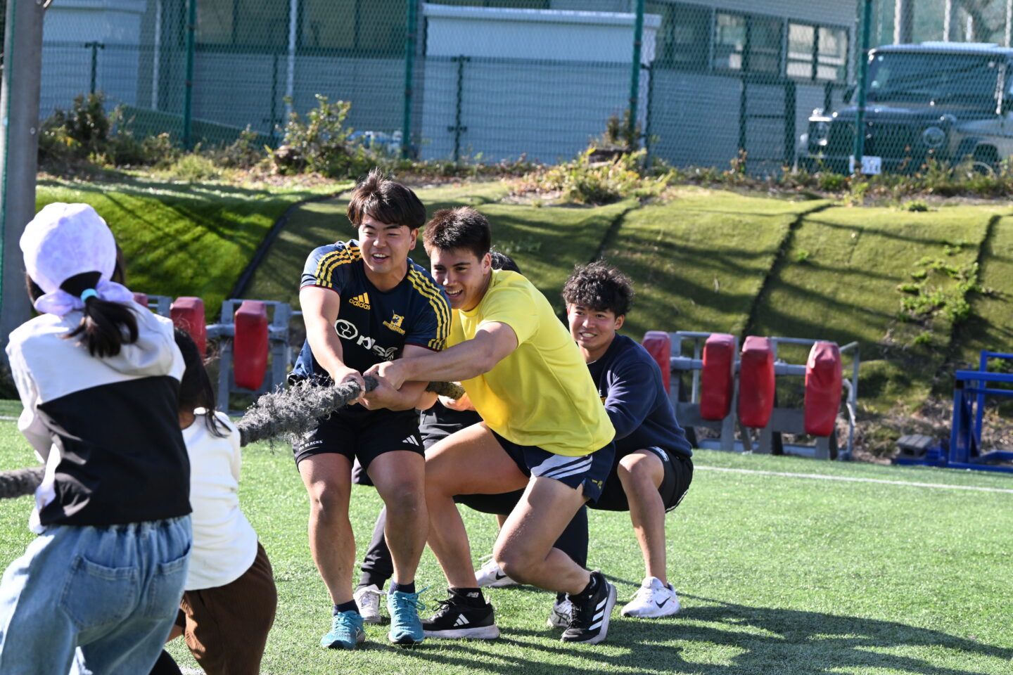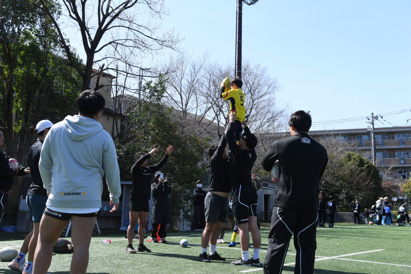 体験に参加してくれた子どもたちからは、「ラグビーボールに初めて触って楽しかった」「選手たちの足がとても速かった」などの感想をいただき、ラグビーの魅力を感じてもらえる貴重な機会となりました。参加した部員にとっても、元気いっぱいに走り回る子どもたちと触れ合うことで、改めてスポーツの楽しさや地域の方々とのつながりを実感する時間となりました。